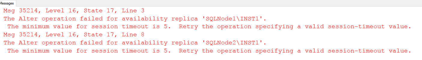 Alternatively, you use the ALTER AVAILABILITY GROUP statement to modify the session_timeout values. The below scripts modifies the session timeout value to 20 seconds.