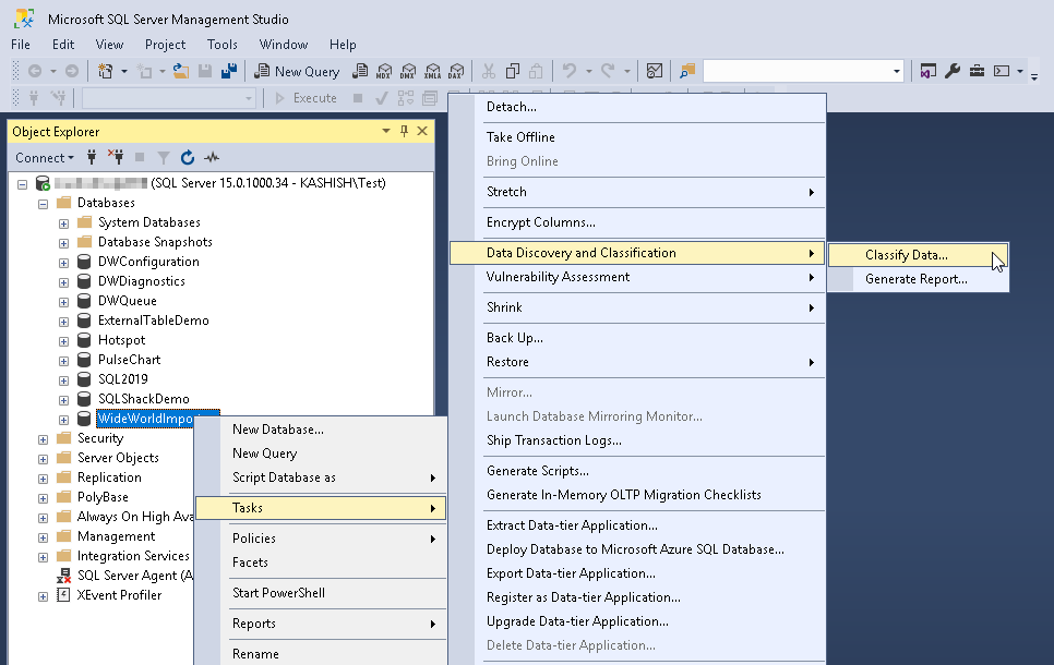 SQL Server Management Studio 17.5 introduced a new feature for data discovery and data classification into different categories. This helps to discover sensitive data such as SSN number, credit card number, bank account details, personal records etc. It is very critical for the data to be secure and compliant under SOX, PCI, and GDPR for each organization. The Classify data features adds extended properties to the columns to specify the label and the information type.
