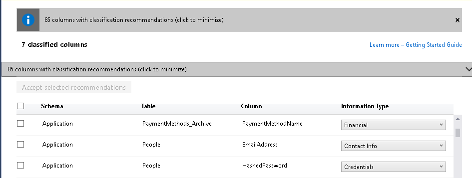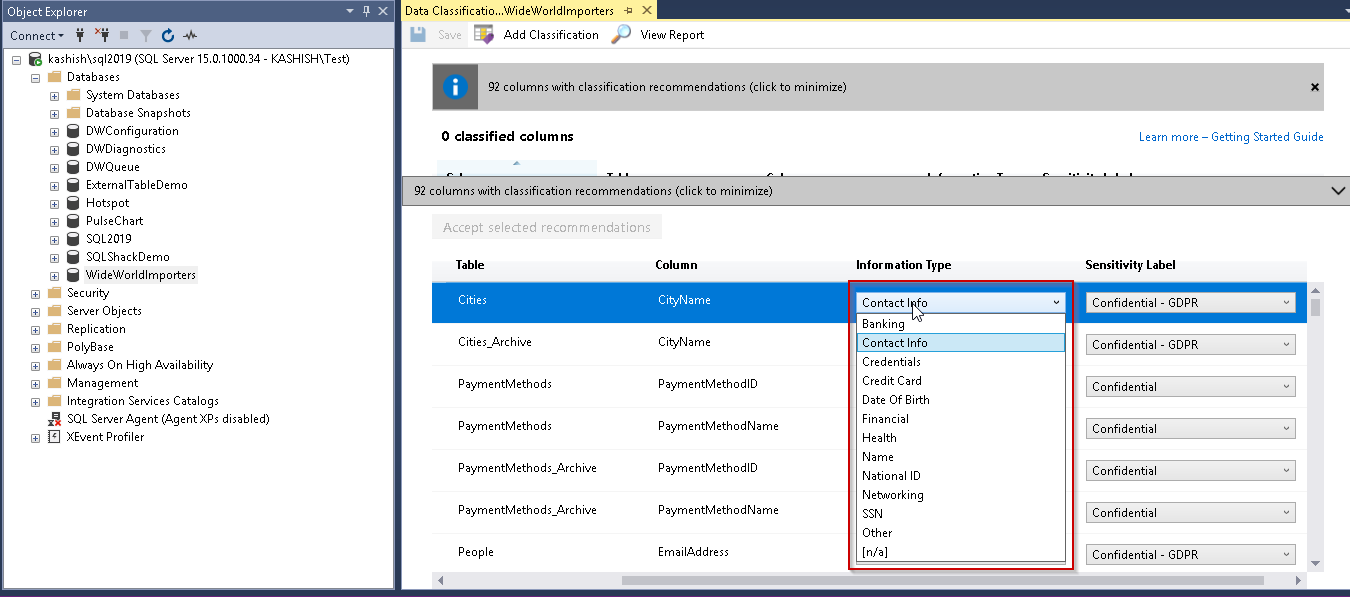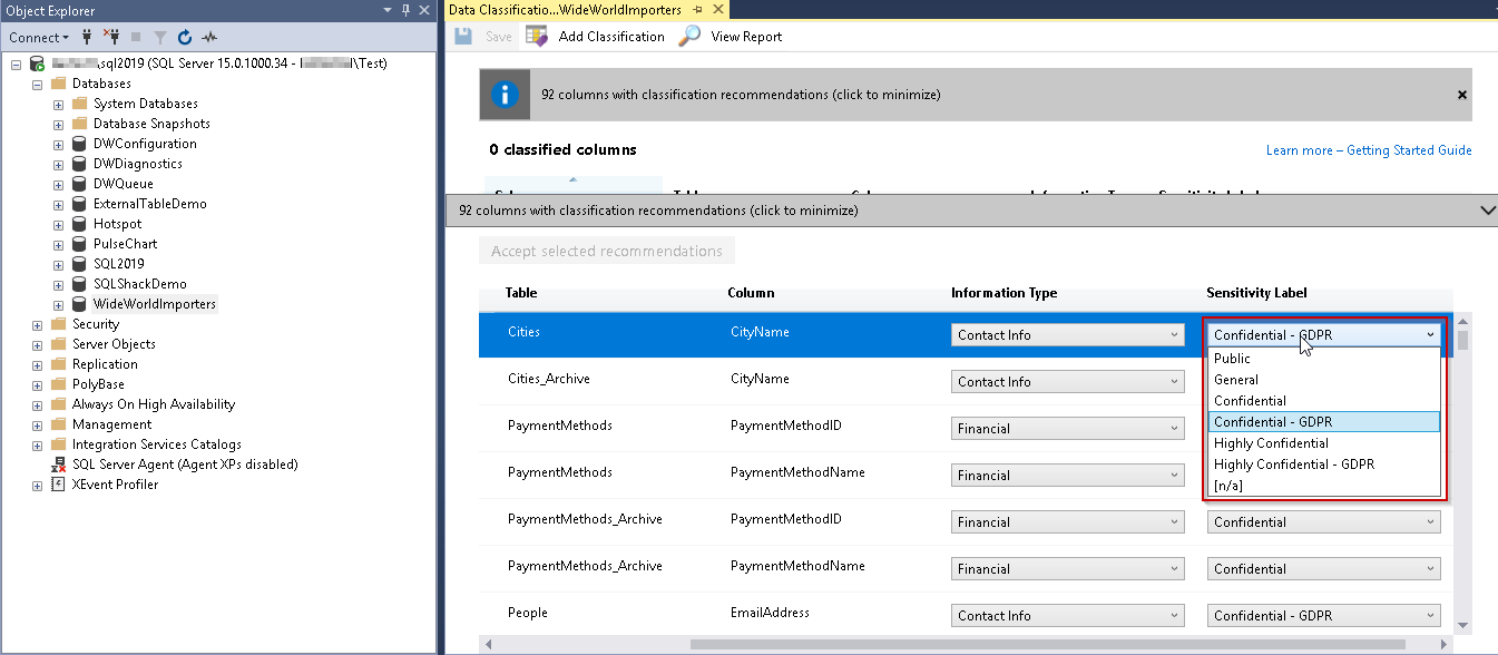 If we run the ‘Classify Data’ on WideWorldImporters database, we get the ‘Data Classification’ report.