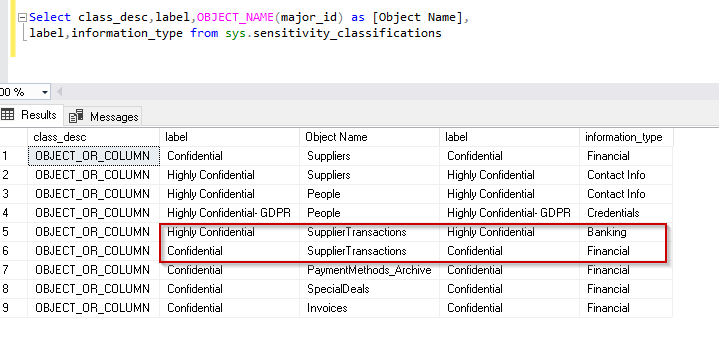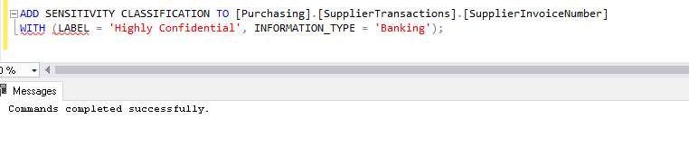 ADD SENSITIVITY CLASSIFICATION TO [Purchasing].[SupplierTransactions].[SupplierInvoiceNumber] WITH (LABEL = 'Highly Confidential', INFORMATION_TYPE = 'Banking'); |