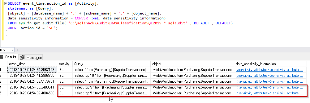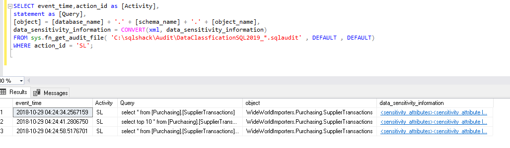 SELECT event_time,action_id as [Activity], statement as [Query], [object] = [database_name] + '.' + [schema_name] + '.' + [object_name], data_sensitivity_information = CONVERT(xml, data_sensitivity_information) FROM sys.fn_get_audit_file( 'C:\sqlshack\Audit\DataClassficationSQL2019_*.sqlaudit' DEFAULT , DEFAULT) WHERE action_id = 'SL'; --SL filtered out events for select statements. |