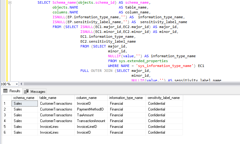 SELECT Schema_name(objects.schema_id) AS schema_name, objects.NAME AS table_name, columns.NAME AS column_name, ISNULL(EP.information_type_name,'') AS information_type_name, ISNULL(EP.sensitivity_label_name,'') AS sensitivity_label_name FROM (SELECT ISNULL(EC1.major_id,EC2.major_id) AS major_id, ISNULL(EC1.minor_id,EC2.minor_id) AS minor_id, EC1.information_type_name, EC2.sensitivity_label_name FROM (SELECT major_id, minor_id, NULLIF(value,'') AS information_type_name FROM sys.extended_properties WHERE NAME = 'sys_information_type_name') EC1 FULL OUTER JOIN (SELECT major_id, minor_id, NULLIF(value,'') AS sensitivity_label_name FROM sys.extended_properties WHERE NAME = 'sys_sensitivity_label_name') EC2 ON ( EC2.major_id = EC1.major_id AND EC2.minor_id = EC1.minor_id )) EP JOIN sys.objects objects ON EP.major_id = objects.object_id JOIN sys.columns columns ON ( EP.major_id = columns.object_id AND EP.minor_id = columns.column_id ) |