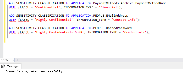 ADD SENSITIVITY CLASSIFICATION TO APPLICATION.PaymentMethods_Archive.PaymentMethodName WITH (LABEL = 'Confidential', INFORMATION_TYPE = 'Financial'); ADD SENSITIVITY CLASSIFICATION TO APPLICATION.PEOPLE.EMailAddress WITH (LABEL = 'Highly Confidential', INFORMATION_TYPE = 'Contact Info'); ADD SENSITIVITY CLASSIFICATION TO APPLICATION.PEOPLE.HashedPassword WITH (LABEL = 'Highly Confidential- GDPR', INFORMATION_TYPE = 'Credentials'); |
