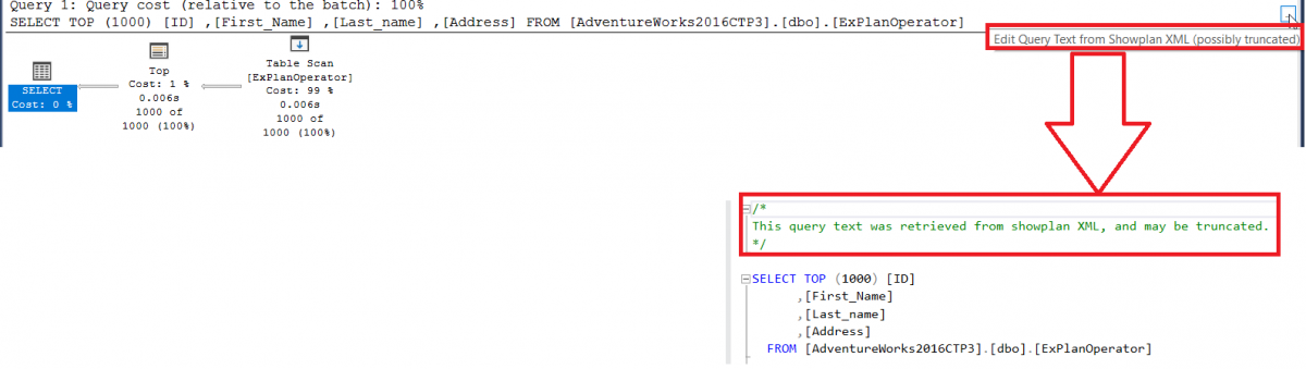 In SSMS 18.0, Microsoft included a new comment in the upper portion of the SQL execution plan, when moving the mouse pointer or clicking on the Edit Query Button for the SQL Execution Plan, that the text of the submitted query may be truncated. This comment helps to inform the user that, if the query text exceeds the 4000 characters, it will be truncated by the SQL engine. This was occurring with me previously while editing long queries, but this time SSMS informs us about this truncation in advance, as shown below: