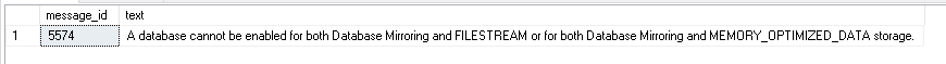 - A database cannot be enabled for both Database Mirroring and FILESTREAM or for both Database Mirroring and MEMORY_OPTIMIZED_DATA storage (Microsoft SQL Server, Error 5574)