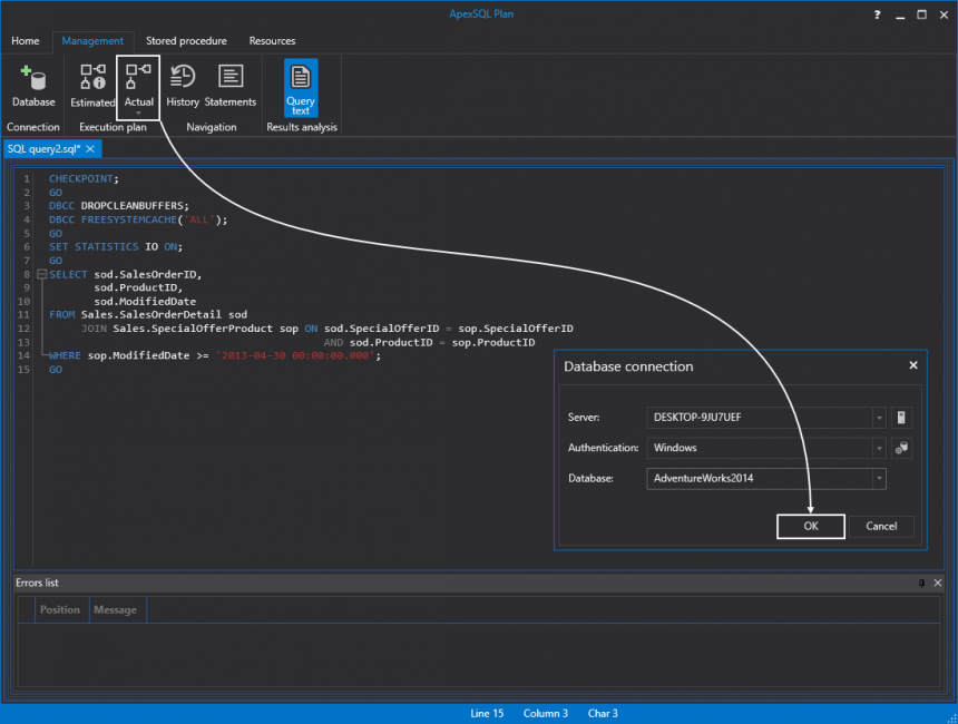 Next, let’s get the actual execution plan by simply pasting the code in ApexSQL Plan and clicking the Actual button. This will prompt the Database connection dialog first time in which we have to choose the SQL Server, authentication method and the appropriate database to connect to: