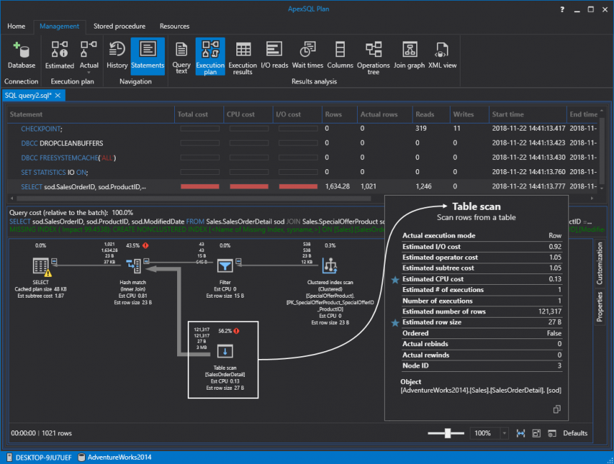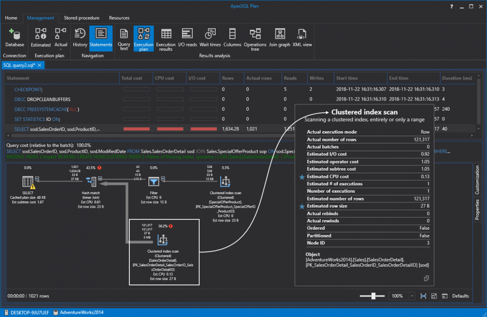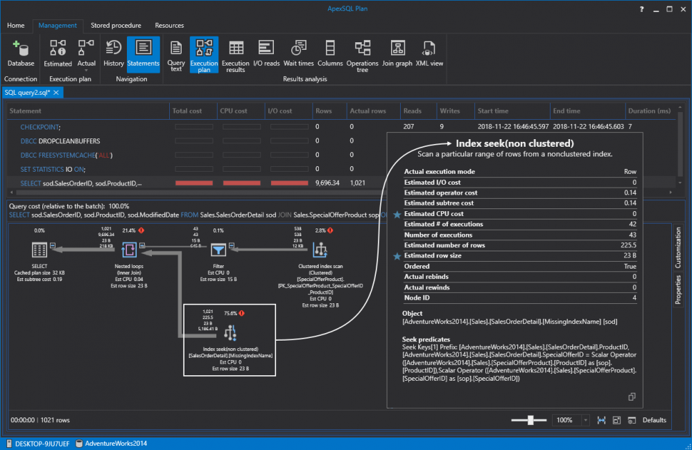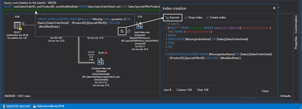 However, we paved the way for the future nonclustered SQL indexes. So, without further ado let’s create a nonclustered index. Notice that ApexSQL Plan determines missing indexes and create queries for (re)creating them from the tooltip. Feel free to review and edit the default code or just hit Execute to create the index: