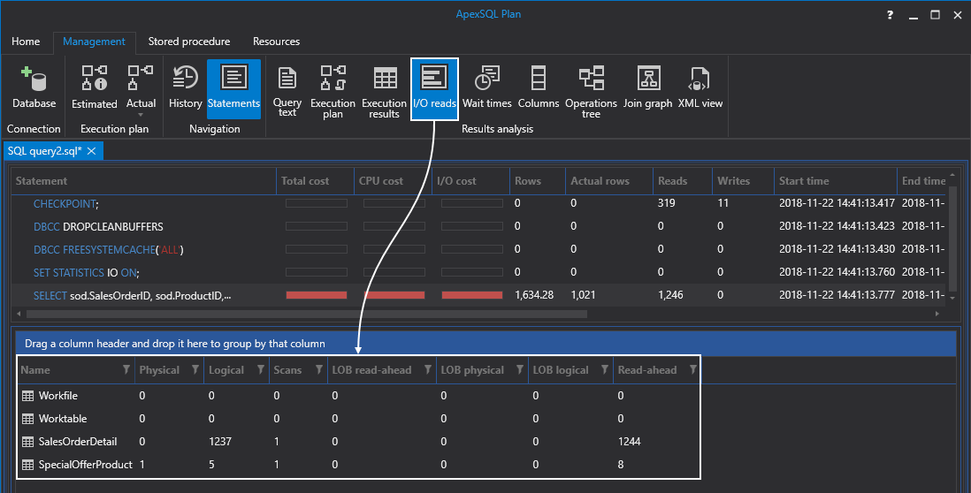 When creating SQL indexes, I always like to set SQL Server to display information of disk activity generated by queries. So the first thing we can do is to enable IO statistics. This is a great way to see how much work SQL Server has to do under the hood to retrieve the data. We also need to include the actual execution plan and for that, I like to use a SQL execution plan viewing and analysis tool called ApexSQL Plan. This tool will show us the execution plan that was used to retrieve the data so we can see what SQL indexes, if any, are used. When using ApexSQL Plan, we don’t really need to enable IO statistics because the application has advanced I/O reads stats like the number of logical reads including LOB, physical reads (including read-ahead and LOB), and how many times a database table was scanned. However, enabling the stats on SQL Server can help when working in SQL Server Management Studio. The following query will be used as an example: