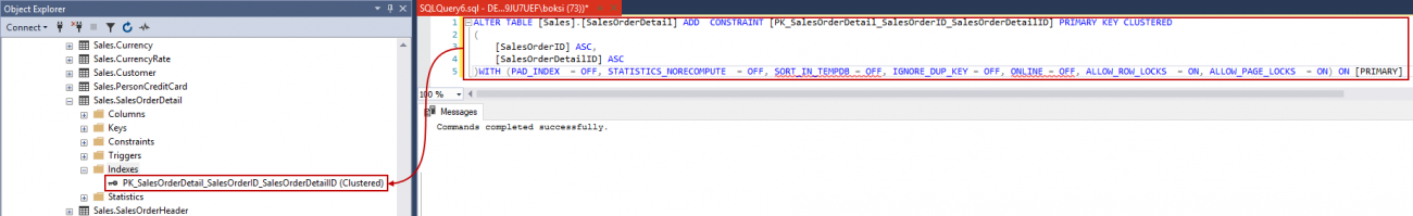 After executing the above query, we will have a clustered index created by a primary key constraint. If we refresh the Indexes folder in Object Explorer, we should see the newly created clustered, unique, primary key index: