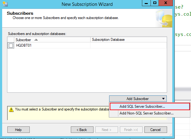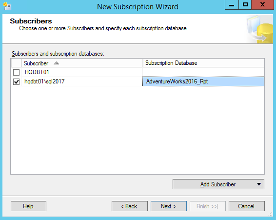On the Subscribers page, select Add Subscriber, and then select Add SQL Server Subscriber from the drop-down. This step opens the Connect to Server dialog box. Enter the subscriber instance name and then select Connect.