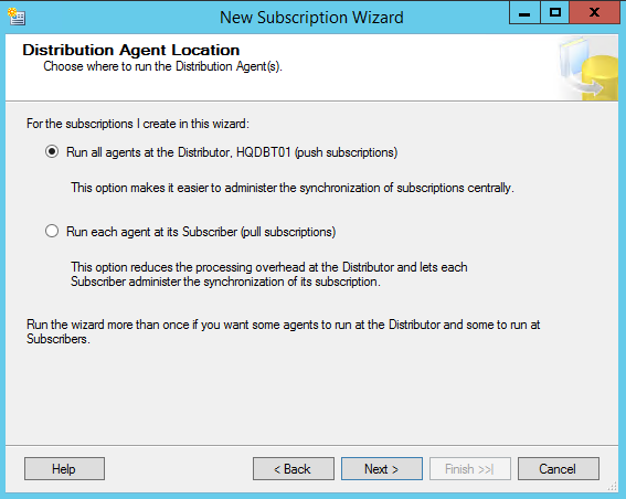 On the Distribution Agent location page, select “Run all agents at the Distributor” and Click Next