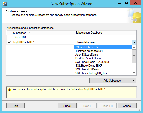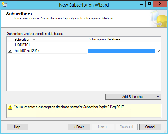 After the subscriber SQL instance has been added, select the drop-down next to the instance name of your subscriber. Then select New Database under Subscription Database and type in the database name and Click Ok.