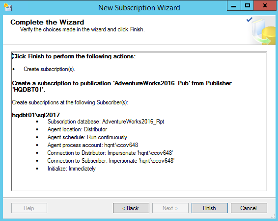 The subscription database is created and registered to the subscriber. Now, click Next. Make sure that the account has db_owner permission on the newly created database.