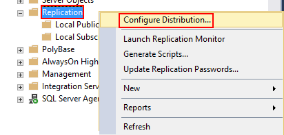 In Object Explorer, browse to the replication folder, right-click the Replication folder, and click Configure Distribution