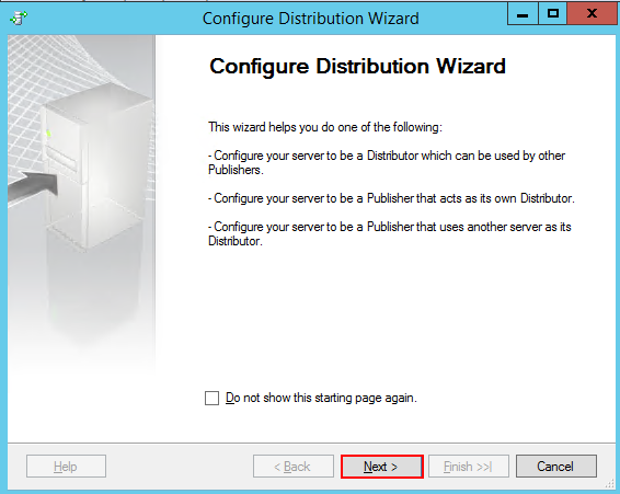 The first page of the Distribution Configuration Wizard appears. The pages outline the general details about configuration distributor aka Configure Distribution Wizard