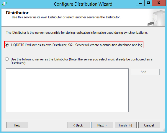 The following steps walk you through the process of creating the SQL replication Distributor: