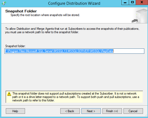 Next, in the configure Snapshot Folder, type in the path of the SQL replication snapshot folder or leave the default path of the SQL replication snapshot folder. The snapshot folder is used for initial data synchronization of transactional replication and make sure it is large enough to hold all the replicated data. In this case, I’ll leave the default values and Click Next.