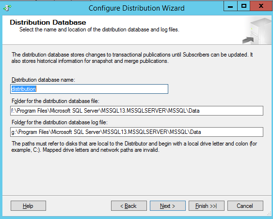 Now, configure the SQL replication distribution database. Specify the name of the distribution database and the folders where the data and log files should be located. Again, no change in the default values is required. Click Next.