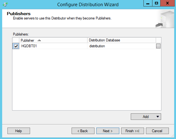 In the Publishers page, specify the SQL replication Publishers that are going to access the Distributor and Click Next