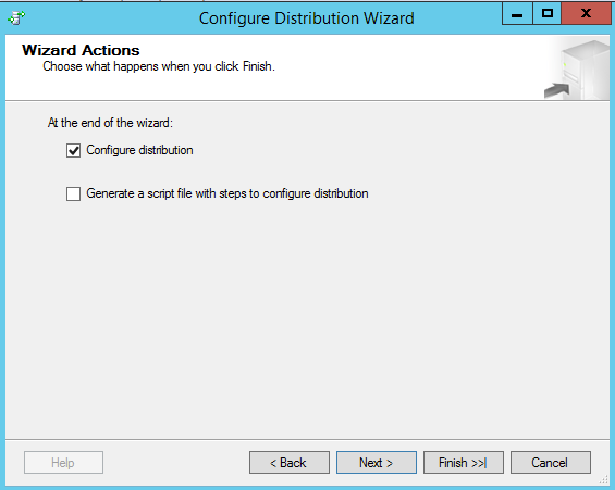 In the complete the wizard page, Review the settings and configuration options, and then click Finish to enable the Distributor