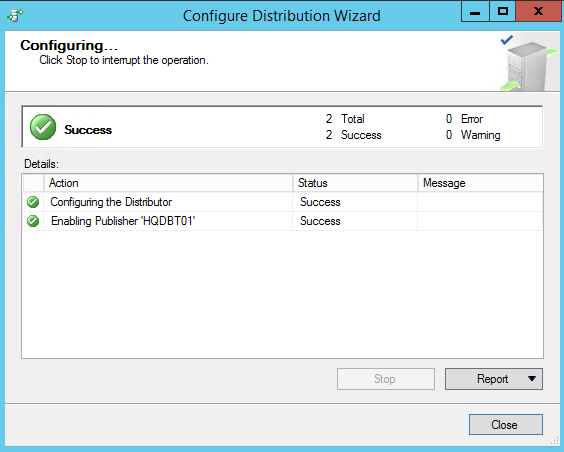 Now, for Configuring… the following page appears and it shows the progress of the distributor setup.