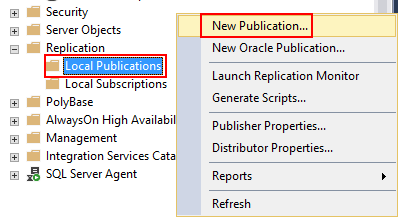 In Object Explorer, locate the Replication folder, right-click Local Publication, and then click New Publication
