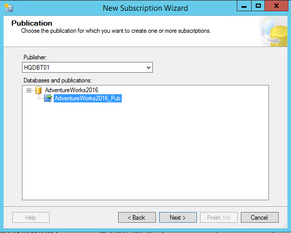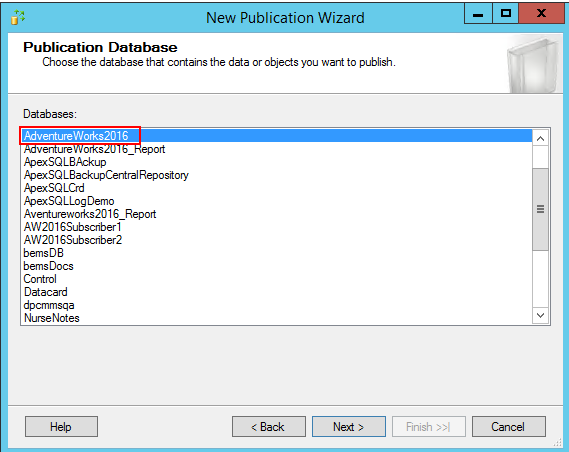 In the Publication Database page, select the Adventureworks2016 database and click Next.