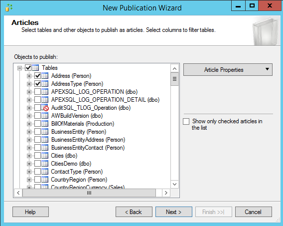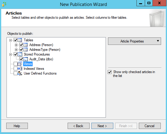 Once you’re done with the object selection, Check the Show only checked articles in the list option to list candidates of Publication. In this case, 2 tables, 1 Stored Procedures are selected.