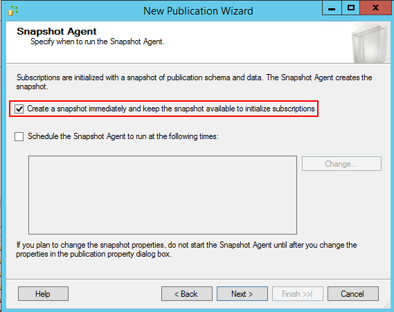 In the Snapshot Agent page specify when to run the Snapshot Agent. It can be run immediately or it can schedule to run at a later time. In this case, Create a snapshot immediately is used.