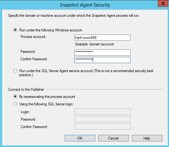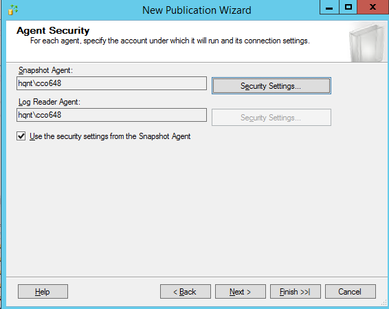 Now, in the Agent Security page, specify the account to use to run the Snapshot Agent using Security settings…