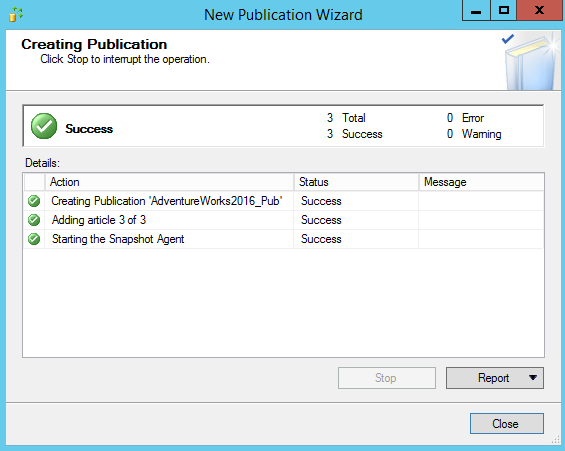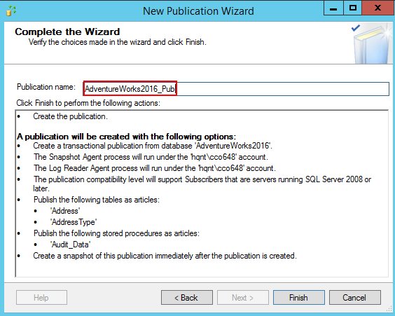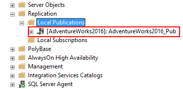 The exercises demonstrate how to configure SQL Replication to copy a few tables, stored procedures and views from AdventureWorks2016 sample database to another database. To keep this setup simple, we use SQL Server Management Studio. The transactional replication setup has a single SQL Server instance to play the roles of SQL replication Publisher, Distributor, and another SQL Server instance play the role of the SQL replication Subscriber.