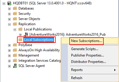 In Object Explorer, expand the Replication folder, right-click Local Subscriptions, and then click New Subscriptions