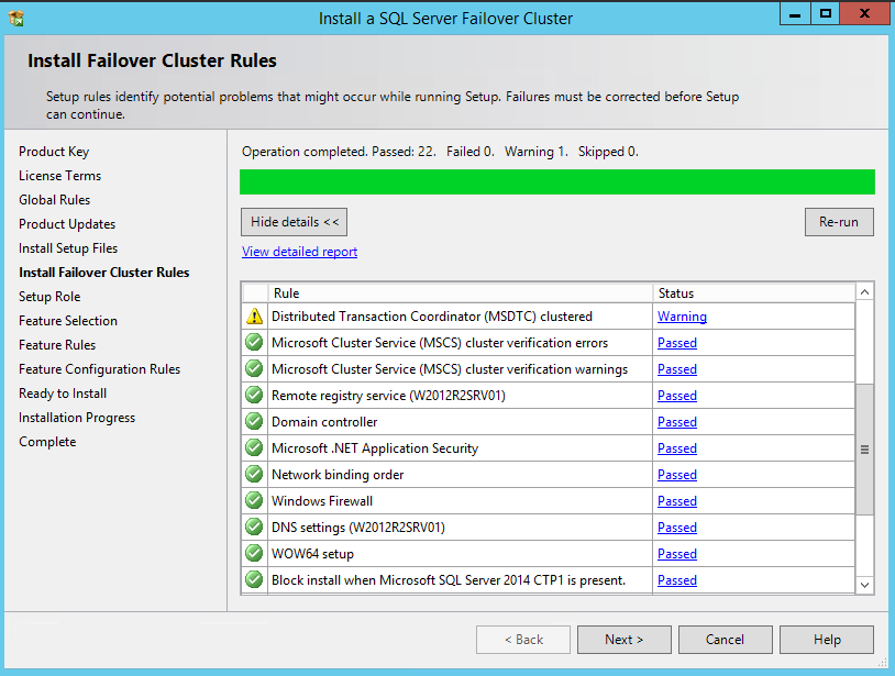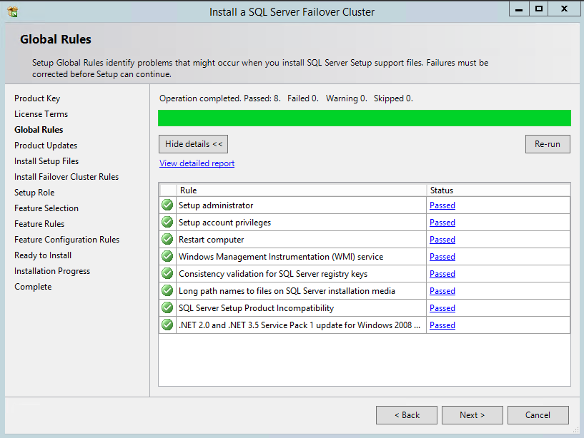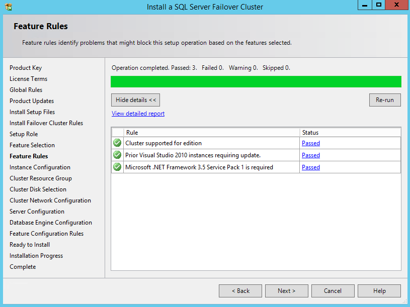 After the successful .Net Framework 3.5 installation we can go back to the SL Server Setup Wizard and click in the “Re-Run” button. This time no problems were found. Click Next (if SQL Server Setup don’t do this for you – that thing is becoming smarter 🙂