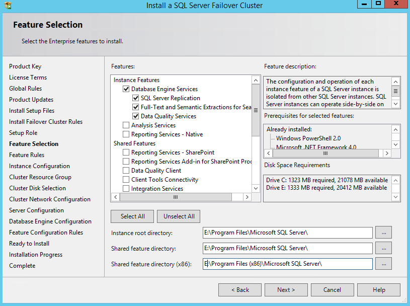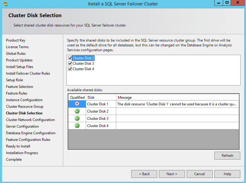 At this step, you have a list of all the available disks. If you compare this list with the Failover Cluster Manager, you will notice that this is the same. Only the available storage will be available here. Sometime you have more storage in the available storage list, so you won’t need to select everything, so pay attention here. In my case, I had only the storage that I need to install my clustered instance, so I’m good to select all and proceed.