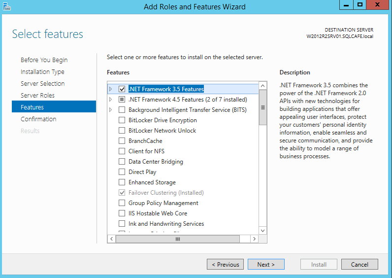 Now select the server where you are going to install, and jump to the “Features” page (select the option in the left menu). Now Select the first option “.NET Framework 3.5 features” and proceed with the installation.