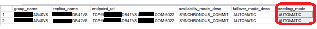 A new field is added to the sys.availability_replicas system table to list the seeding mode for all replicas, that can be joined with sys.availability_groups to include the availability groups information as in the below script: