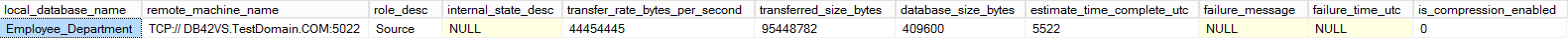 select local_database_name , remote_machine_name,role_desc ,internal_state_desc ,transfer_rate_bytes_per_second ,transferred_size_bytes ,database_size_bytes,estimate_time_complete_utc ,failure_message ,failure_time_utc, is_compression_enabled from sys.dm_hadr_physical_seeding_stats |