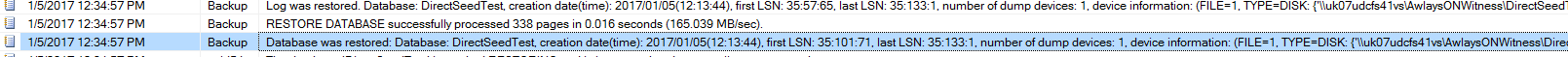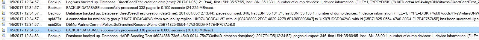 It is clear from the previous logs that the direct seeding process is completed successfully; started at 12:34:53 and finished at 12:34:57, taking 4 seconds to seed the secondary replica completely.