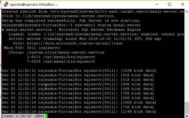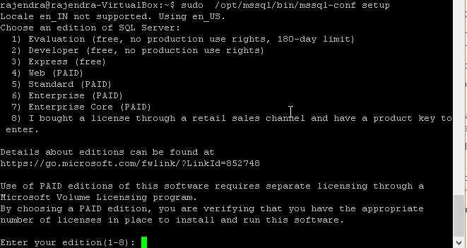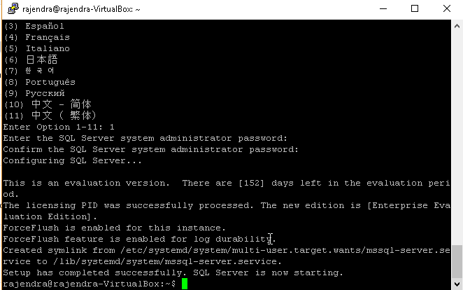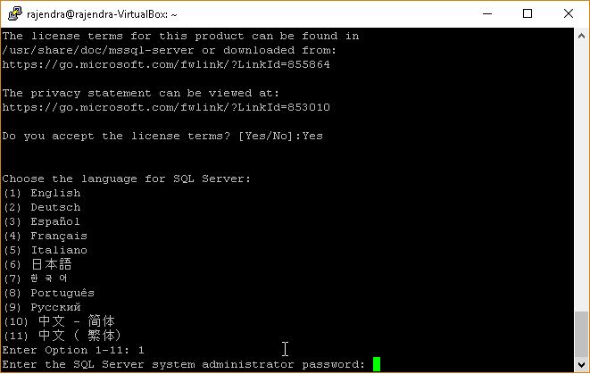 At this point, you get the image of SQL Server instance on the Ubuntu. However, in order to use this SQL instance, we need to run ‘sudo /opt/mssql/bin/mssql-conf setup’.