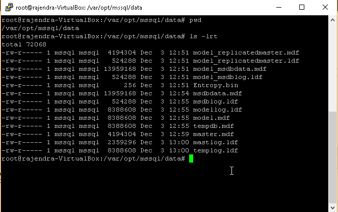 The default directory for the data files and the log files in Ubuntu is /var/opt/mssql/data. We can go to the directory and view the content using the ls -lrt command.
