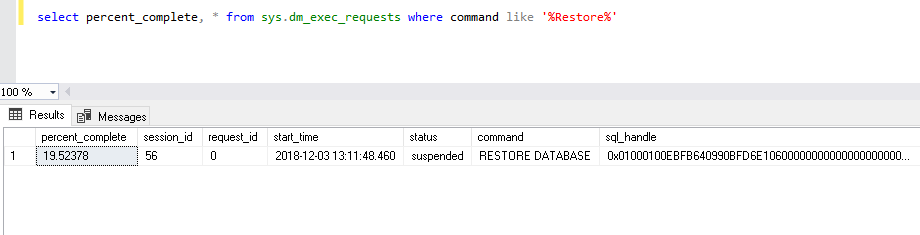 Select percent_complete, * from sys.dm_exec_requests where a command like ‘%Restores%’