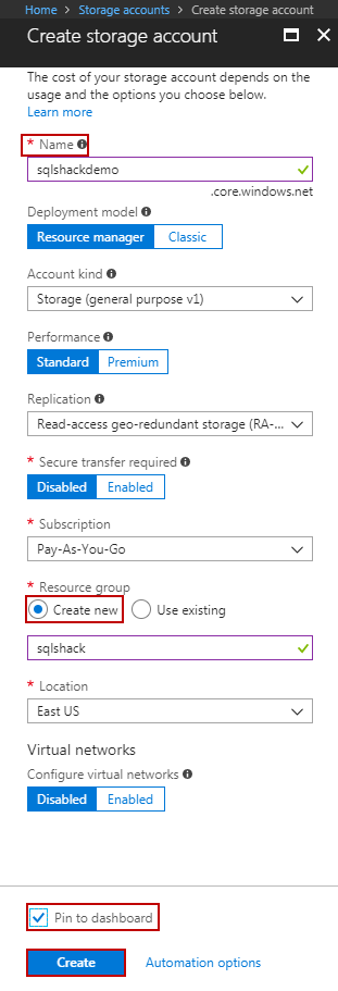 The following information is required to create a storage account:- Name: sqlshackdemo; a unique name, all lowercase letters