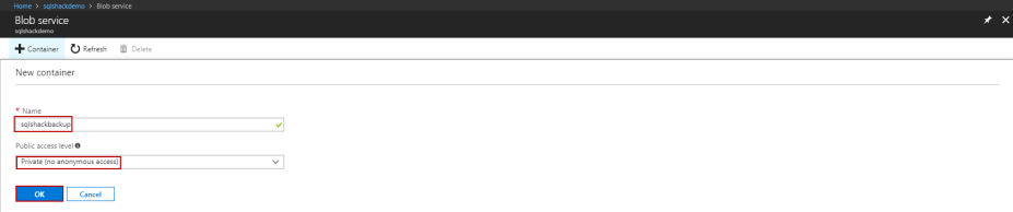 - Name the container; I chose sqlshackbackup. Remember that the name has to be all lowercase letters.