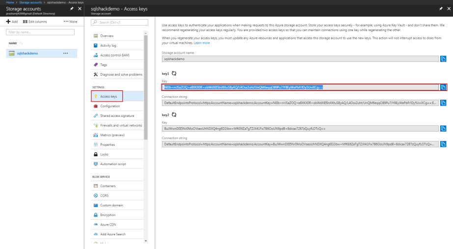 The Access key is the secret key of the storage account. To find the access key, click on Settings and select Access keys in the Storage account blade. To the right, you should fine key1, which is the access key, select the Copy to clipboard icon. Save this key information somewhere safe. The syntax to create to credential is as follows: