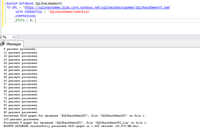 BACKUP DATABASE SQLShackDemoATC TO URL = 'https://sqlshackdemo.blob.core.windows.net/sqlshackbackupdemo/SQLShackDemoATC.bak' WITH CREDENTIAL = 'SQLShackDemoCredential' ,COMPRESSION ,STATS = 5; |
