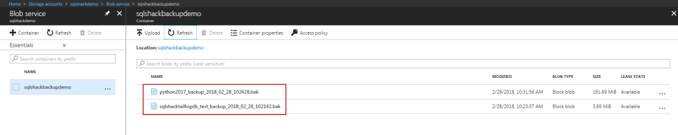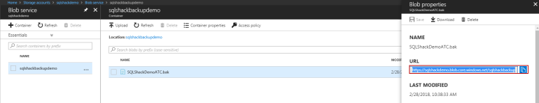 Validate the output by browsing the blob storage. We can see that the SQLShackDemoATC.bak file exists at the storage. We can browse the URL of the file and this pointer is used in the upcoming section to restore the database.