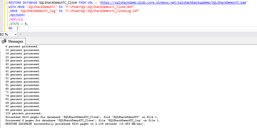RESTORE DATABASE SQLShackDemoATC_Clone FROM URL = 'https://sqlshackdemo.blob.core.windows.net/sqlshackbackupdemo/SQLShackDemoATC.bak' WITH MOVE 'SQLShackDemoATC' to 'f:\PowerSQL\SQLShackDemoATC_Clone.mdf' ,MOVE 'SQLShackDemoATC_log' to 'f:\PowerSQL\SQLShackDemoATC_CloneLog.ldf' ,NORECOVERY ,REPLACE ,STATS = 5; GO |