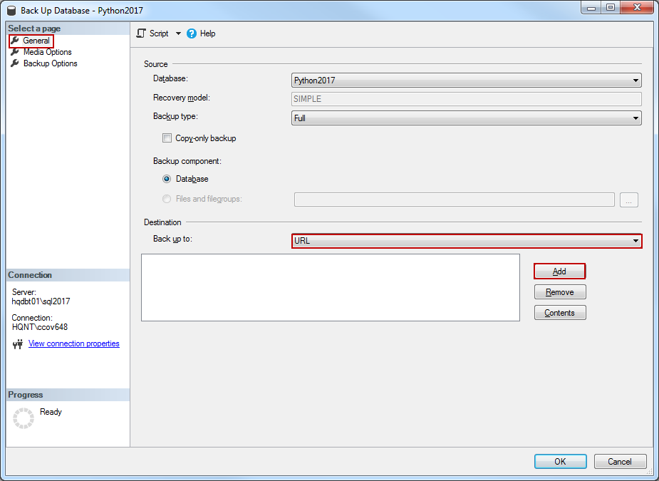 On the General page, go to the Destination section. At the Back up to: drop-down list, select URL, and then click Add. This will open the Select Backup Destination dialog box