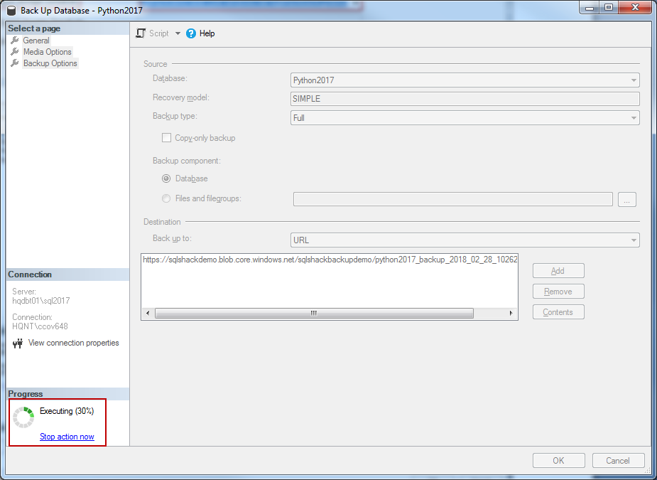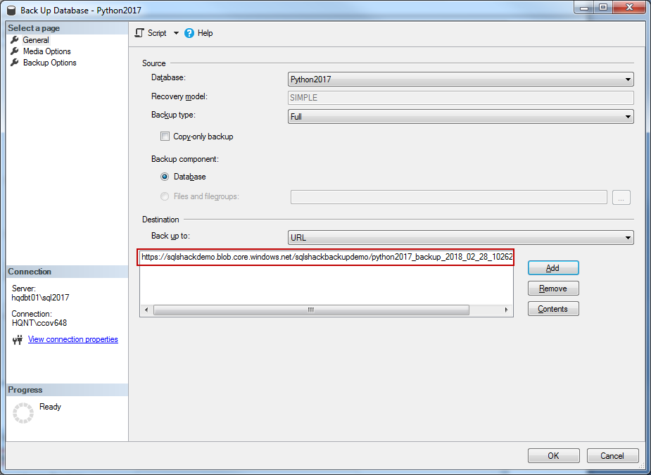 Now, you’re in the Back Up Database wizard window. At the destination field, we can see the URL of the backup file at the storage.