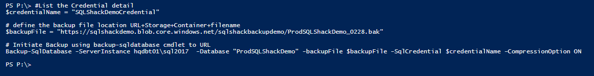 #List the Credential detail $credentialName = "SQLShackDemoCredential" # define the backup file location URL+Storage+Container+filename $backupFile = "https://sqlshackdemo.blob.core.windows.net/sqlshackbackupdemo/ProdSQLShackDemo.bak" # Initiate Backup using backup-sqldatabase cmdlet to URL Backup-SqlDatabase -ServerInstance hqdbt01\sql2017 -Database "ProdSQLShackDemo" -backupFile $backupFile -SqlCredential $credentialName -CompressionOption ON |